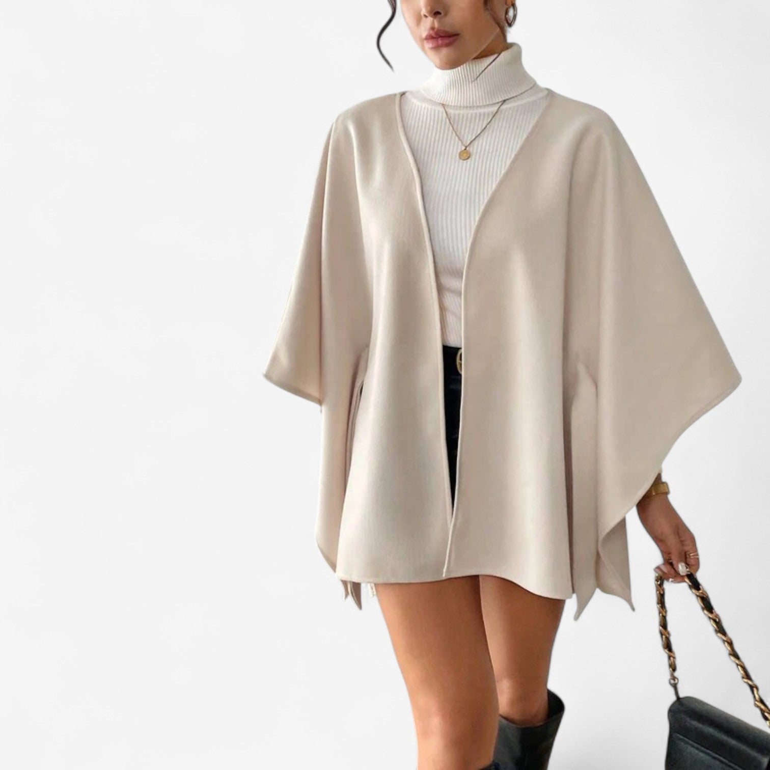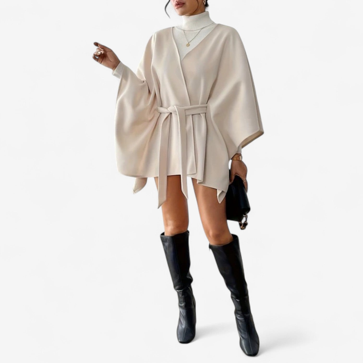 Symphonie de douceur et de grâce, cette cape raffinée épouse la silhouette avec une aisance sculpturale. Son tissu noble ondule avec fluidité, soulignant la taille d'une ceinture délicate qui souligne une sophistication subtile. Les manches larges et le col structuré murmurent une confiance tranquille et une allure moderne. Parfaite de jour comme de nuit, elle allie chaleur et élégance dans un geste intemporel.